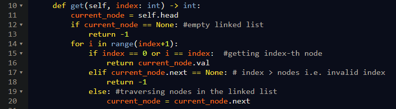 I say "index" because, of course, a linked list doesn't actually have an index. What was meant was to get the index-th node in the linked list. In the problem, we are told to return -1 if a node at that "index" doesn't exist. Otherwise, the value of the node is returned. I traversed the list until I reached the index-th node and returned it.